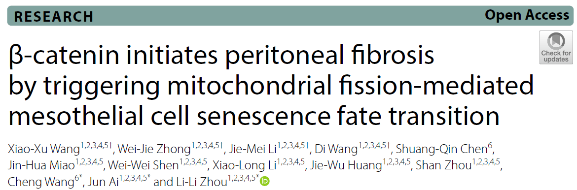 腹膜纤维化是终末期肾病患者接受腹膜透析(PD)时面临的主要临床挑战,长期腹膜透析导致患者的腹膜间皮细胞衰老,但其潜在机制尚未完全阐明。近期南方医科大学南方医院周丽丽、艾军教授团队联合中山大学附属第五医院王成教授团队在Military Medical Research (IF 22.9)上发表文章“β-catenin initiates peritoneal fibrosis by triggering mitochondrial fission-mediated mesothelial cell senescence fate transition”,发现β-catenin-Drp1-TGF-β1轴是腹膜纤维化发生和进展的关键介质。